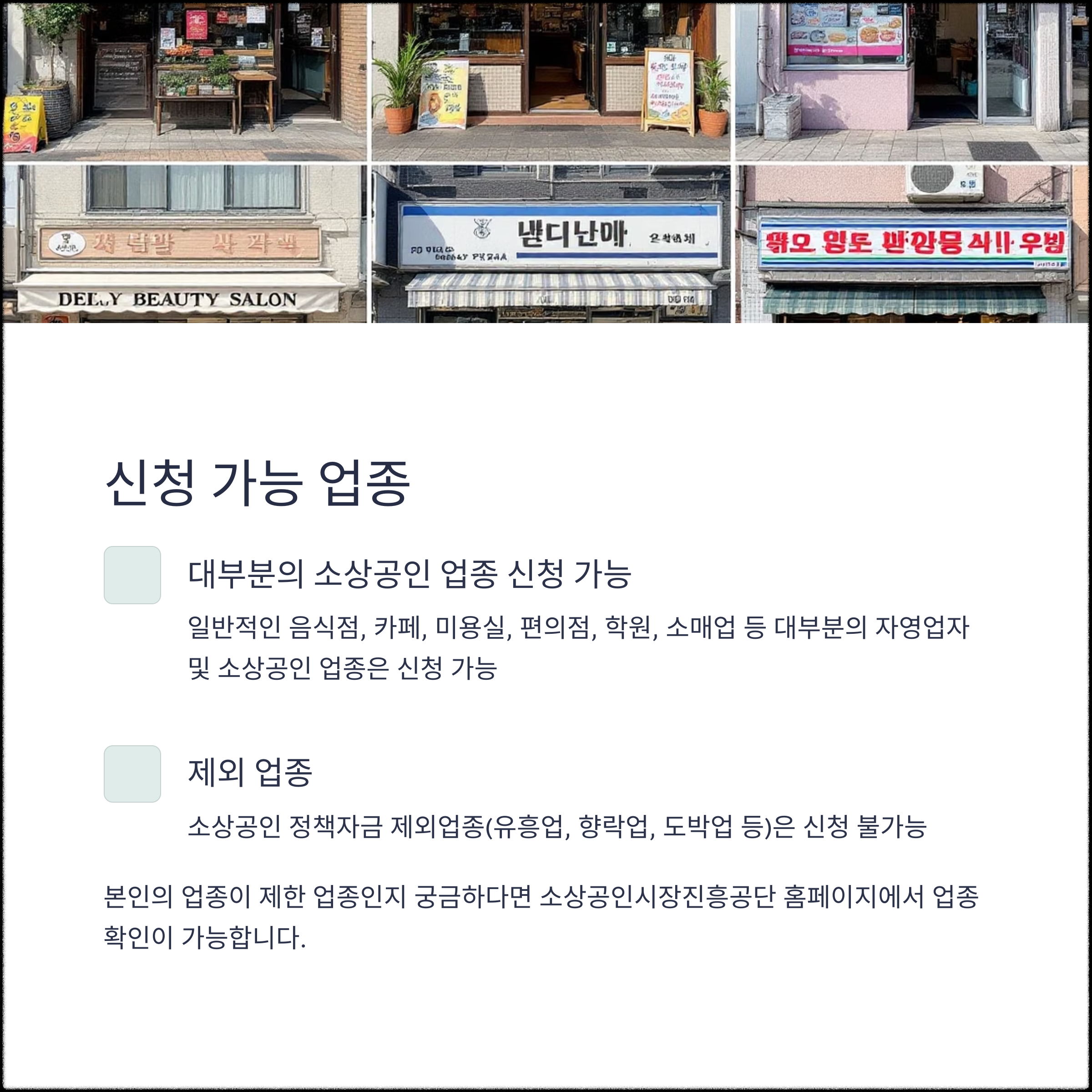 그러나 일반적인 음식점, 카페, 미용실, 편의점, 학원, 소매업 등 대부분의 자영업자 및 소상공인 업종은 신청이 가능합니다. 본인의 업종이 제한 업종인지 궁금하다면 소상공인시장진흥공단 홈페이지에서 업종 확인이 가능합니다.