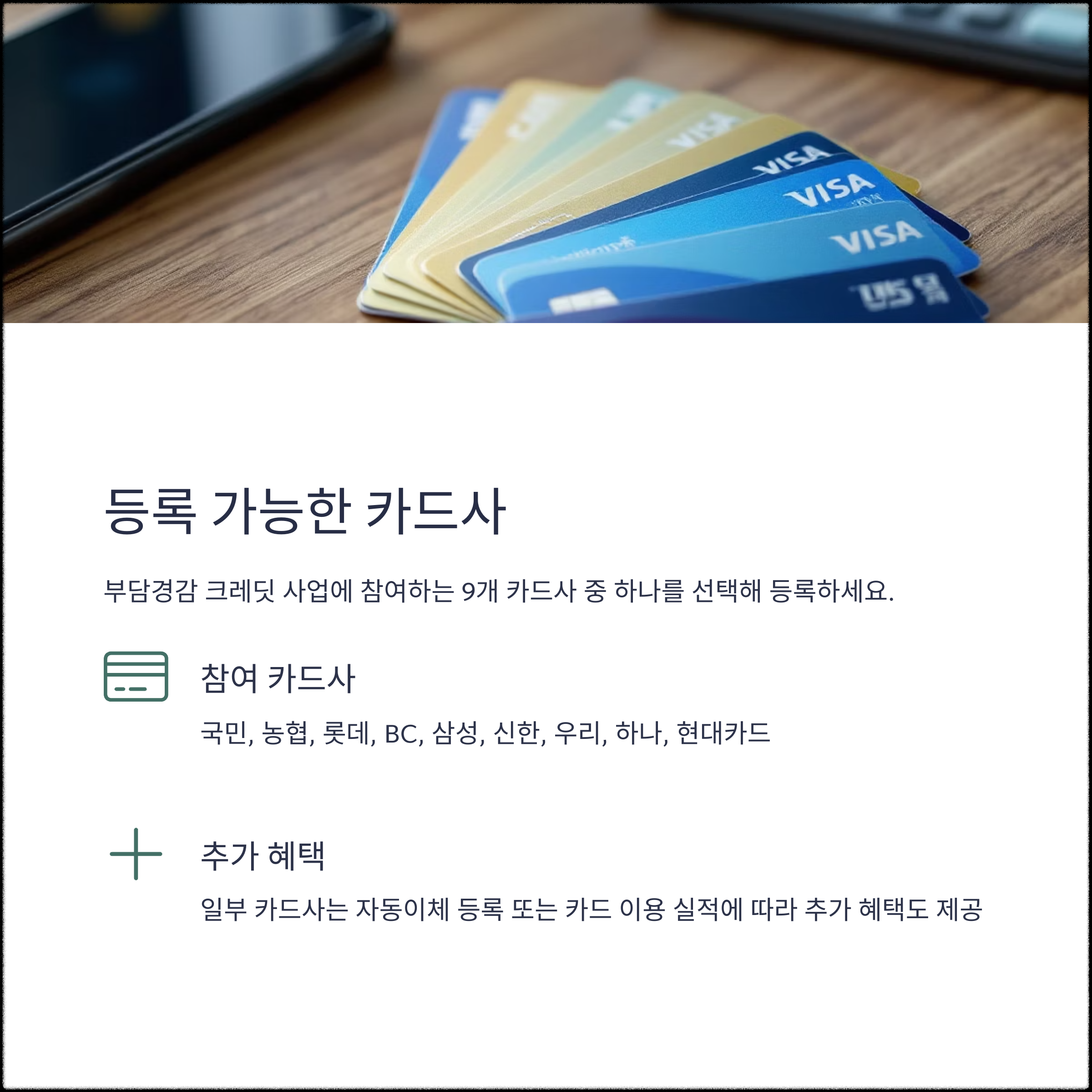 총 9개 카드사가 이번 부담경감 크레딧 사업에 참여하고 있습니다. 국민, 농협, 롯데, BC, 삼성, 신한, 우리, 하나, 현대카드 중 하나를 선택해 신청 시 등록하면 됩니다.