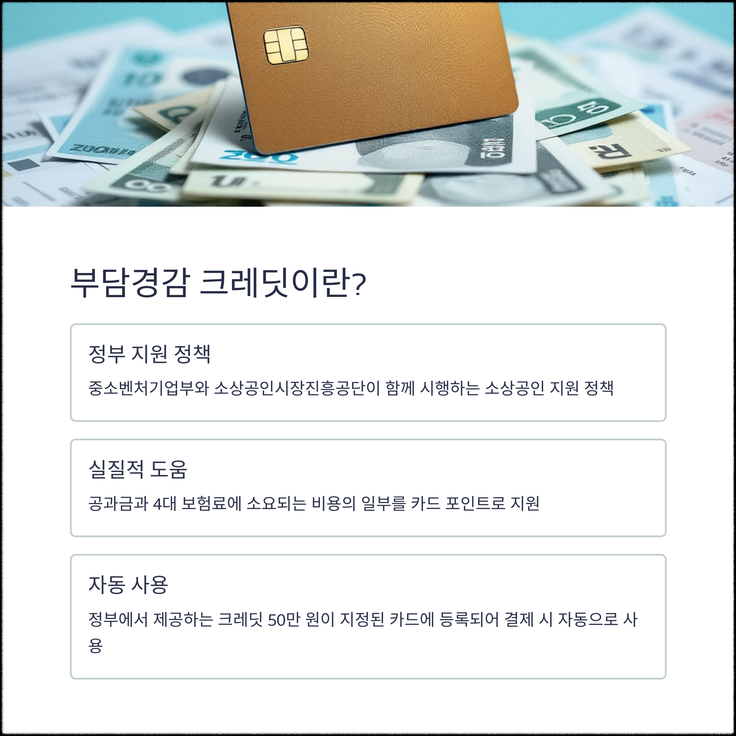 부담경감 크레딧은 중소벤처기업부와 소상공인시장진흥공단이 함께 시행하는 소상공인 지원 정책입니다. 공과금과 4대 보험료에 소요되는 비용의 일부를 카드 포인트로 지원하여 매달 부담되는 고정비를 줄여주는 제도입니다.