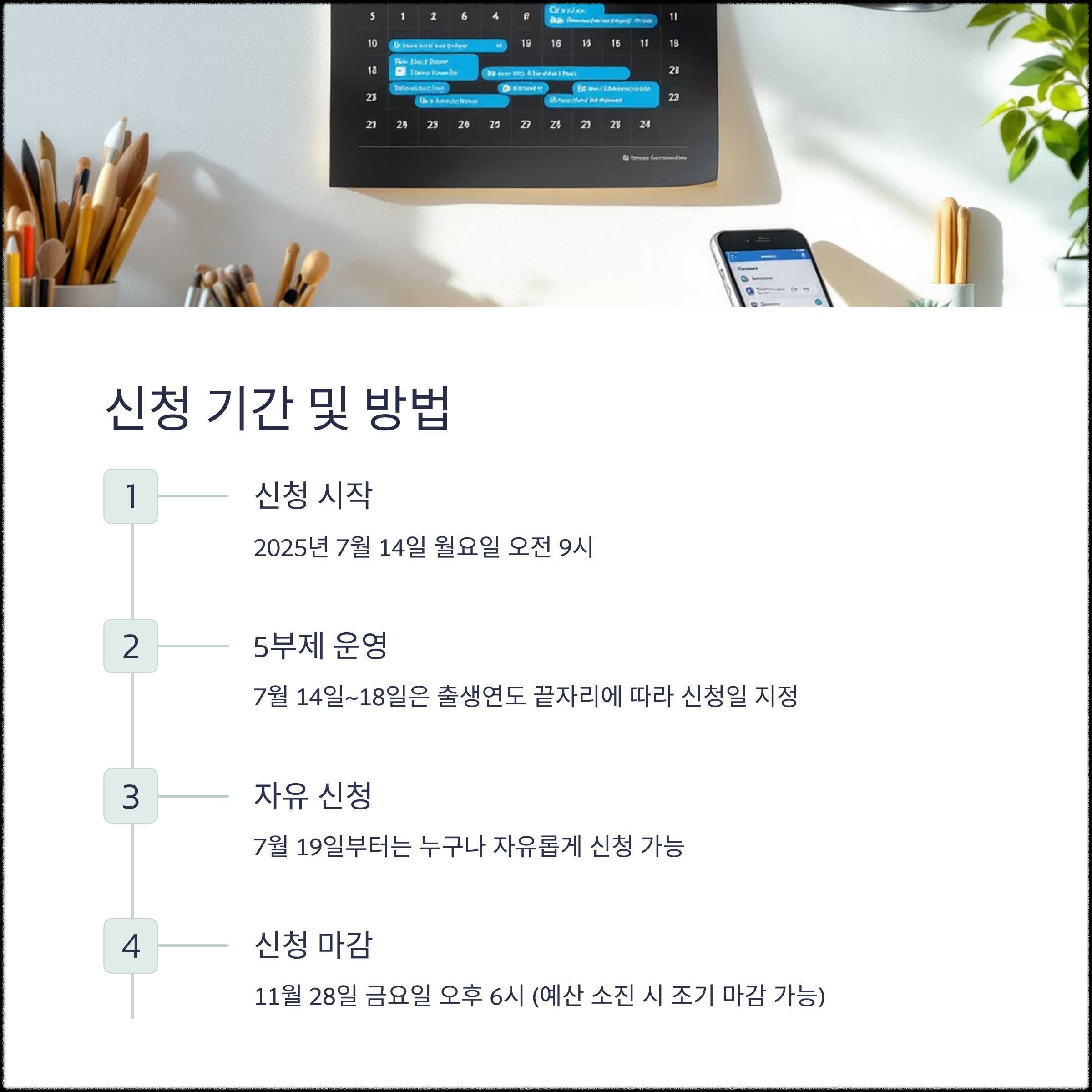2025년 7월 14일 월요일 오전 9시부터 11월 28일 금요일 오후 6시까지입니다. 다만 첫 주(7월 14일~18일)는 5부제로 운영되기 때문에, 신청일에 따라 출생연도 끝자리에 따라 신청 가능한 날짜가 정해져 있습니다.