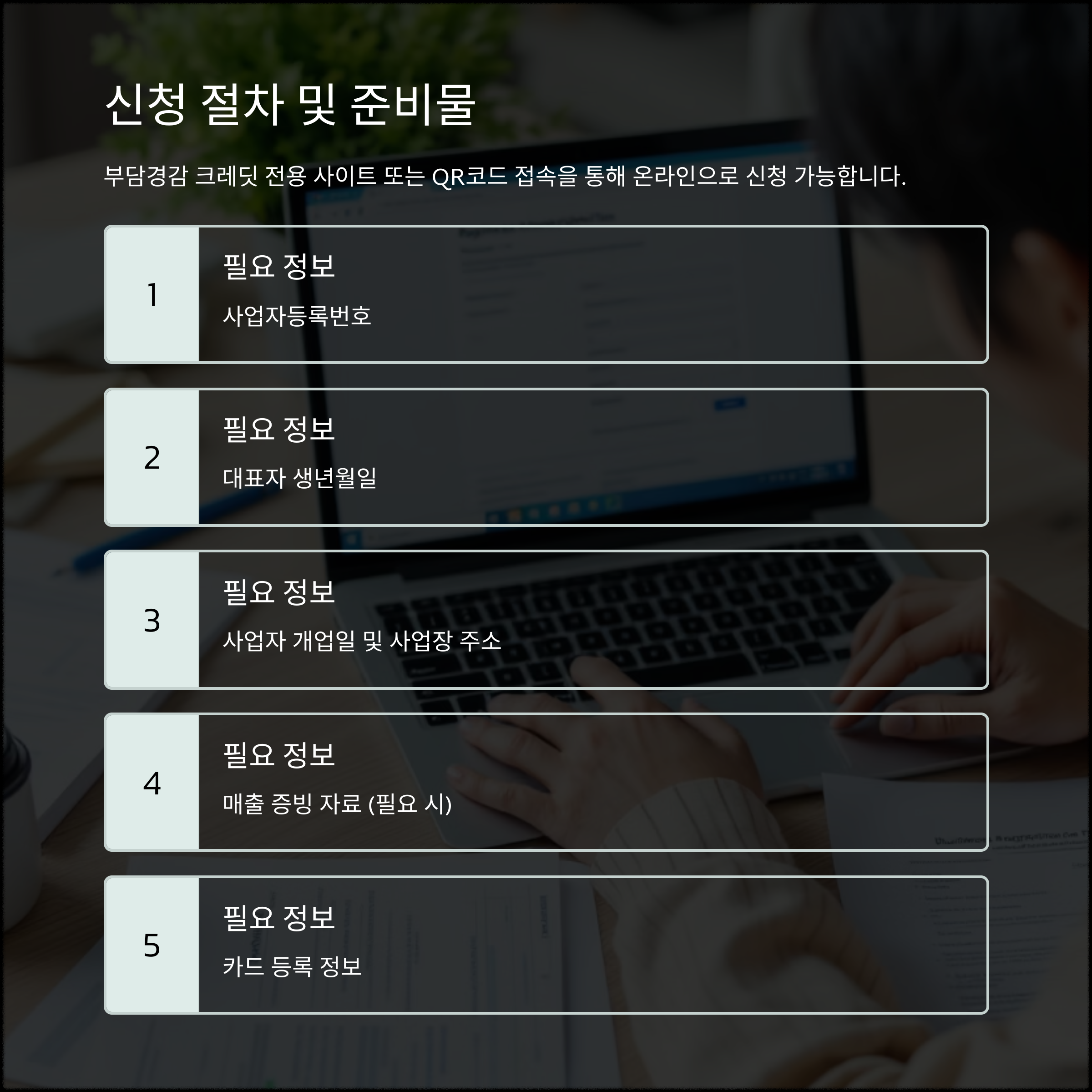 신청은 부담경감 크레딧 전용 사이트 또는 QR코드 접속을 통해 온라인으로 진행됩니다. 신청 절차는 비교적 간단하지만, 준비서류를 미리 챙겨두면 더 빠르게 진행할 수 있습니다. 신청 시 필요한 기본 정보는 다음과 같습니다.