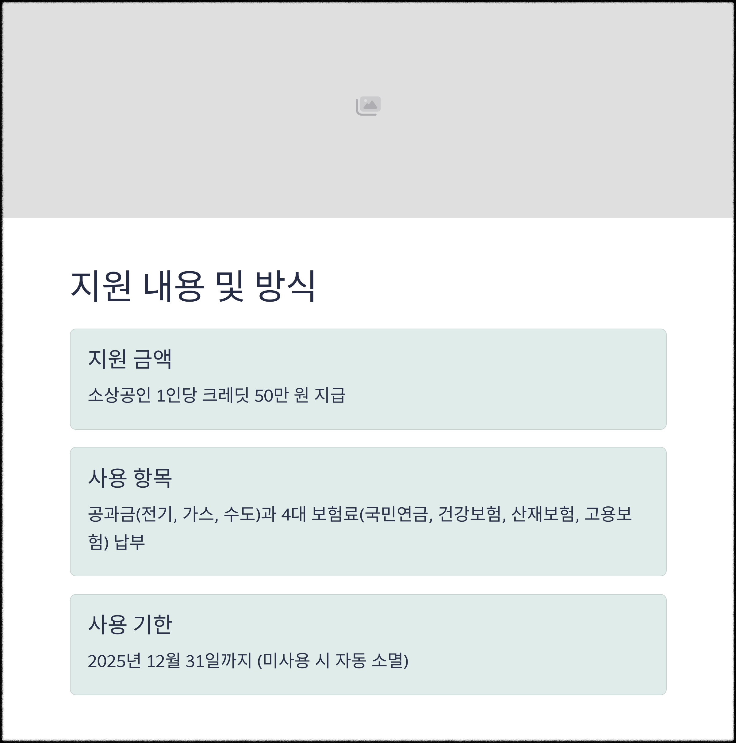 단, 지원 예산은 한정되어 있으므로 조기 마감 가능성을 고려하면 가능한 빠르게 신청하는 것이 가장 좋습니다. 특히 50만 원이라는 크레딧은 매달 고정비 부담이 큰 소상공인에게 실질적인 도움이 될 수 있는 금액입니다.