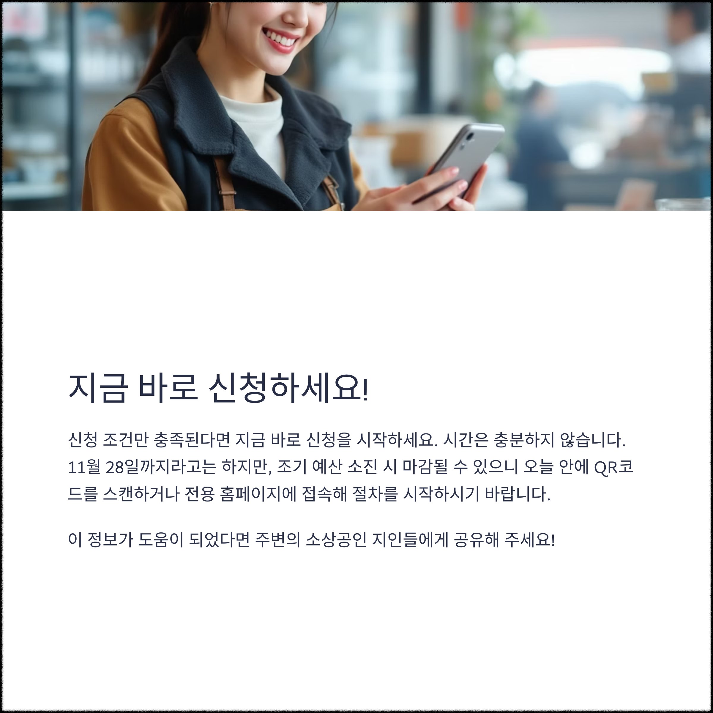 신청 조건만 충족된다면 지금 바로 신청을 시작하세요. 시간은 충분하지 않습니다. 11월 28일까지라고는 하지만, 조기 예산 소진 시 마감될 수 있으니 오늘 안에 QR코드를 스캔하거나 전용 홈페이지에 접속해 절차를 시작하시기 바랍니다.